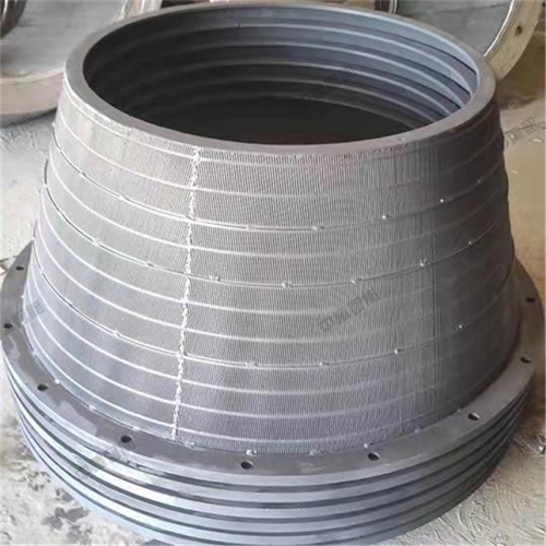 用途:离心机筛篮主要由上法兰、下法兰、加强肋、加强环和不锈钢锥形网筒组成。其中不锈钢锥形网筒由数块扇形筛网组焊而成,扇形筛网是由不锈钢丝轧制成楔形的筛条和支撑条通过专用设备焊接成型的。筛条沿筛篮圆锥母线排列。为了减轻筛缝堵塞筛缝做成楔形。筛缝一般为0.3~1mm,也可根据用户要求而定。筛篮通过上法兰或下法兰上的孔用螺栓与主机连成一体。筛条和支撑条为耐磨无磁不锈钢,一般情况下,其使用寿命为3-4个月。
