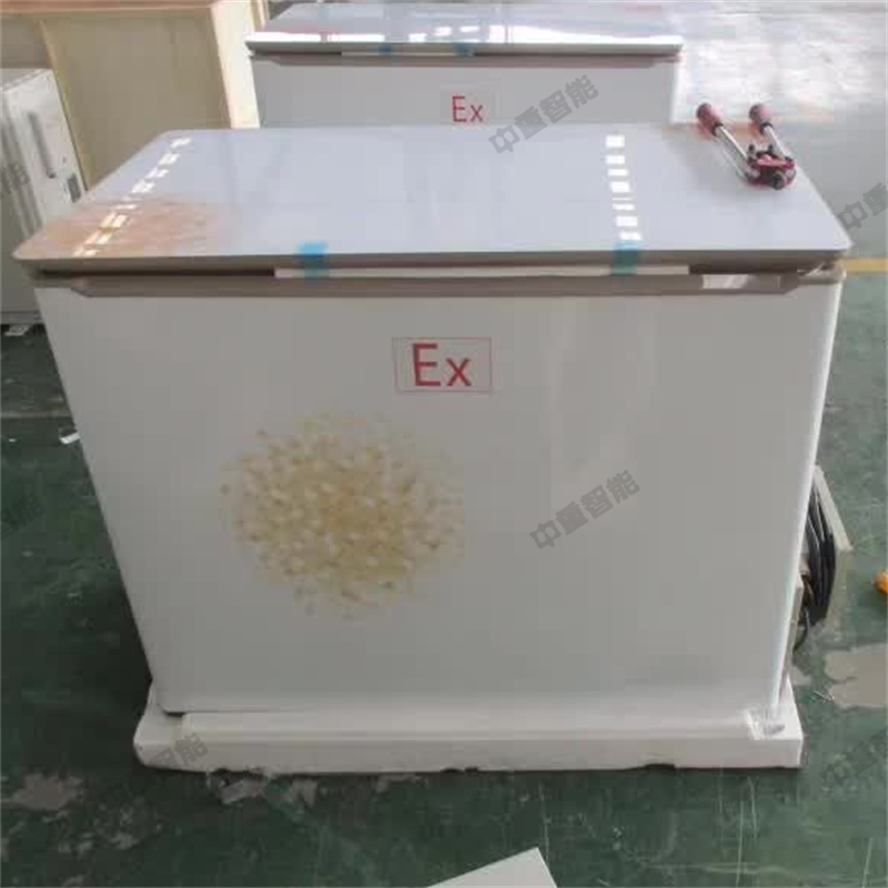 防爆冰箱主要应用在石油、化工、军事、医药、科研、实验室等领域,用于在较低温度下冷却储存药品试剂等常温下不易保存易挥发易燃易爆危险物品。按其结构分有单门、双门和多门及卧式、立式之分。它由制冷压缩机、冷凝器、冷凝器风机、蒸发器、温度控制器组成。为使其能在危险场所安全使用,我们同样采用复合防爆技术对冰箱进行防爆处理。压缩机、冷凝风机采用浇封或隔爆技术处理,温控器作为一个无源开关与防爆有源光耦固态继电器组成本质安全型温度自动控制系统。为保护压缩机不致损坏,采用延时型防爆固态继电器和过载保护及热保护器件,部分控制电器采用隔爆处理。为了防止静电所带来的危害,对冰箱内腔喷涂导电漆消除静电效应,使用更安全。